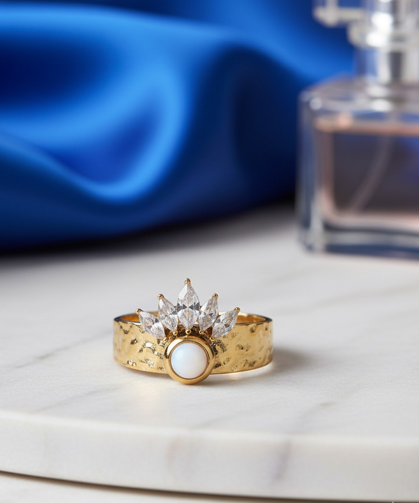 Step up your style with this elegant crown-inspired adjustable ring from Aviva Jewels. Made from premium stainless steel with a hammered gold texture and a white pearl centerpiece, this ring adds a royal touch to any outfit. The adjustable back ensures a comfortable fit for all, making it a perfect accessory for daily, festive, and party wear.