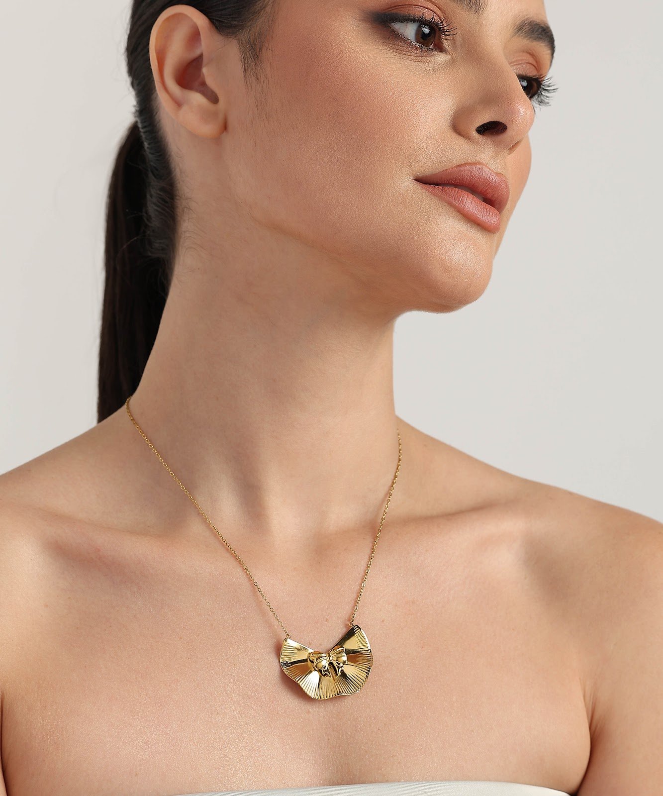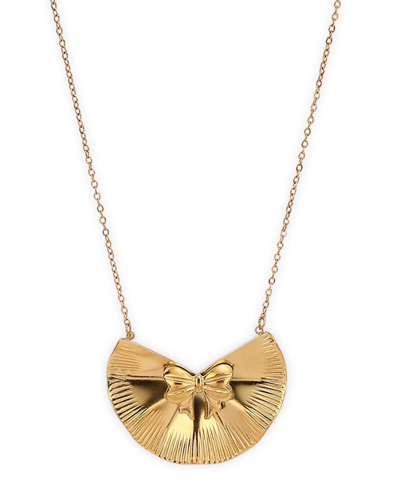 Make a bold style statement with the Aviva Jewels Bow Pendant Necklace, designed with a beautifully pleated fan-style pendant featuring a delicate bow in the center. The gold-plated finish gives it a rich, glamorous look, making it perfect for festive occasions, parties, and weddings. Lightweight and easy to wear, this necklace pairs effortlessly with both traditional and contemporary outfits. A must-have statement piece in every jewellery collection and a thoughtful gift for your loved ones.