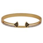 Add a touch of royalty to your collection with the Aviva Jewels Gold Plated Designer CZ Bracelet. Featuring a unique dual-end open design with black enamel detailing and studded with Cubic Zirconia stones, this bracelet is perfect for making a bold yet classy statement.